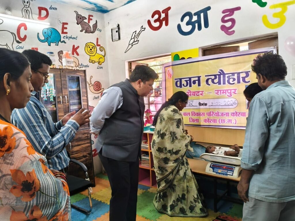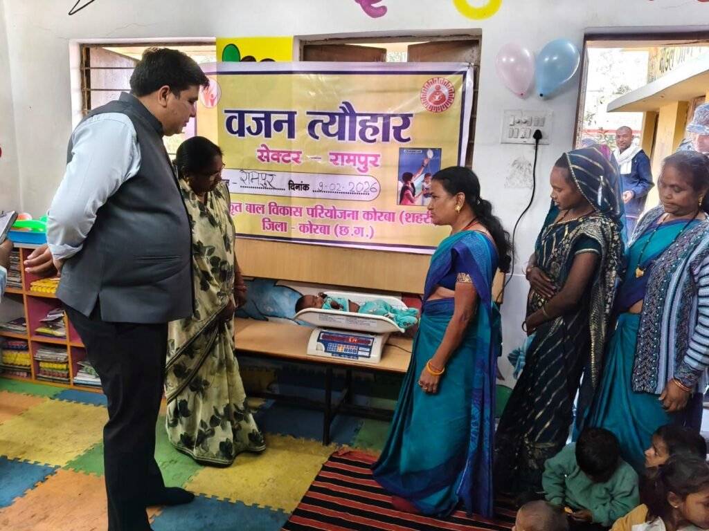 शासन के निर्देशानुसार वजन त्यौहार 2026 का शुभारंभ आज आंगनबाड़ी केन्द्र रामपुर-1, सेक्टर रामपुर, कोरबा (शहरी) में कलेक्टर श्री कुणाल दुदावत द्वारा किया गया। कार्यक्रम में जिला कार्यक्रम अधिकारी श्री बसंत मिंज, वार्ड पार्षद श्रीमती ममता यादव तथा परियोजना अधिकारी श्री मनोज अग्रवाल उपस्थित रहे।